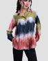 بلوزة بياقة وأكمام طويلة وأزرار عند الأكمام. أزرار أمامية. قصة مريحة مع ثنيات انسيابية. طبعة متعددة الألوان بتأثير صبغ الربط.