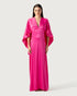 فستان ماكسي بتأثير الساتان، بفتحة رقبة عميقة على شكل حرف V. يتميز بأكمام واسعة منسدلة، وتصميم انسيابي مريح، وحاشية طويلة لإطلالة أنيقة وجريئة.