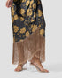 High-waist midi wrap skirt featuring an all-over floral print. Asymmetric hemline finished with long fringe detailing. Self-tie closure at the waist. Soft satin-finish fabric.