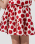 This skirt features a playful polka dot pattern and a stylish tiered ruffled hem. The lightweight fabric and elastic waistband make it comfortable for all-day wear. It's designed to be a versatile piece that can be dressed up or down.