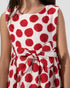 فستان بدون أكمام من قماش خفيف الوزن، مزين بنقشة نقاط بولكا. ياقة دائرية مع فيونكة أمامية وتنورة مجمعة لإطلالة واسعة.